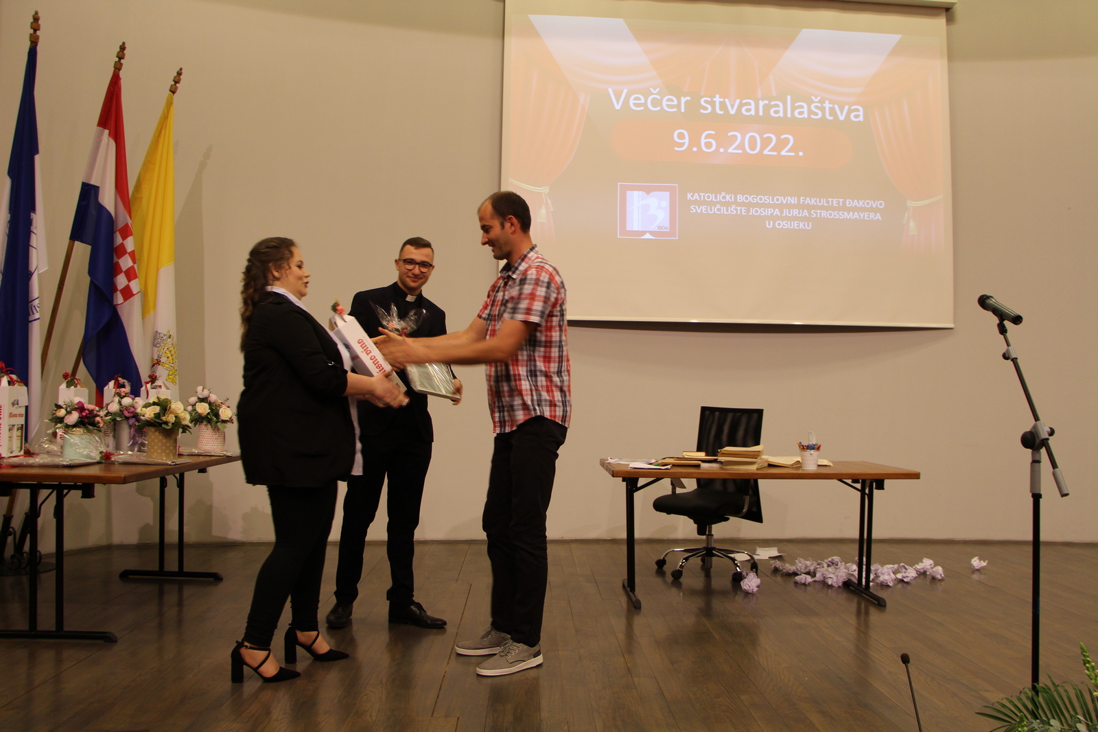 Program Teologijade je započeo tradicionalnom Večeri stvaralaštva đakovačkih studenata. Na početku je mješoviti pjevački zbor pod vodstvom maestra Andrića izveo skladbu Slavite Boga u svetištu Njegovu. Nakon uvodne pjesme su predsjednica organizacijskog odbora Teologijade, Valentina Martinuš i dekan Katoličkog-bogoslovnog fakulteta u Đakovu, izv. prof. dr. sc. Vladimir Dugalić uputili pozdravne govore u kojima su svima izrazili dobrodošlicu. Nakon pozdrava, su prikazani video klipovi u kojima je ukratko predstavljen svaki fakultet. Sljedeća točka je bilo predstavljanje studentskih časopisa, Teofila iz Đakova, koji je predstavila Matea Miličić, Odraza iz Splita te Spectruma iz Zagreba, a primjerci tih časopisa su bili dostupni svima. Program su nastavili Iva Ferbežar na violini i Mario Perinec na glasoviru koji su izveli skladbu Johana Pahelbela Kanon u D-duru. Nakon njihove izvedbe je uslijedila predstava Riječ Božja dolazi u grad u izvedbi dramske skupine KBF- u Đakovu. Također je u programu nastupila i studentica Marija Hardi koja je predstavila svoju društvenu igru Učini pravu stvar koju je izdala Kršćanska sadašnjost s ciljem poticanja razvoja moralnih načela kod djece i mladih. Također je nastupio i student Tomislav Dobrijević iz Zagreba sa svojom autorskom pjesmom Čovjek iz Asiza. Posljednja je nastupila Ana Umiljanović koja je kazivala stihove pjesme O, daj mi, Dobri, biti mi daj! Fra Bonaventure Dude. Na temelju ankete među studentima, Studentski zbor je dodijelio nagrade profesorima koji su se najviše istaknuli u obogaćivanju studentskog života, a to su izv. prof. dr. sc. Suzana Vuletić, prodekanica fakulteta te mr. sc. Drago Marković. Također su dodijeljene nagrade najboljim djelatnicima izvannastavnih službi, a to su Marin Ivanišić i Vlado Tolušić. Studenti koji su se najviše istaknuli u izvannastavnih aktivnostima su Lucija Šimunić u mješovitom pjevačkom zboru, u Teofilu, Maria Dragomirović te u KBFTV-u Ivan Vuković te su i oni dobili priznanja. Dekan je na kraju zahvalio Valentini Martinuš za velik doprinos Teologijadi te je i ona dobila zahvalnica. U tom govoru je i svečano otvorio Teologijadu te je zbor otpjevao himnu Teologijade koju su napisali Lucija Šimunić i Bogdan Rudinski.