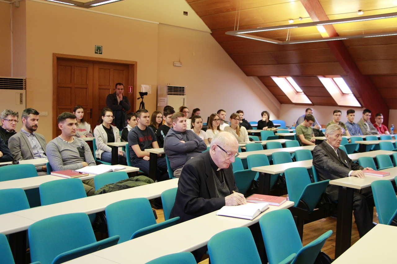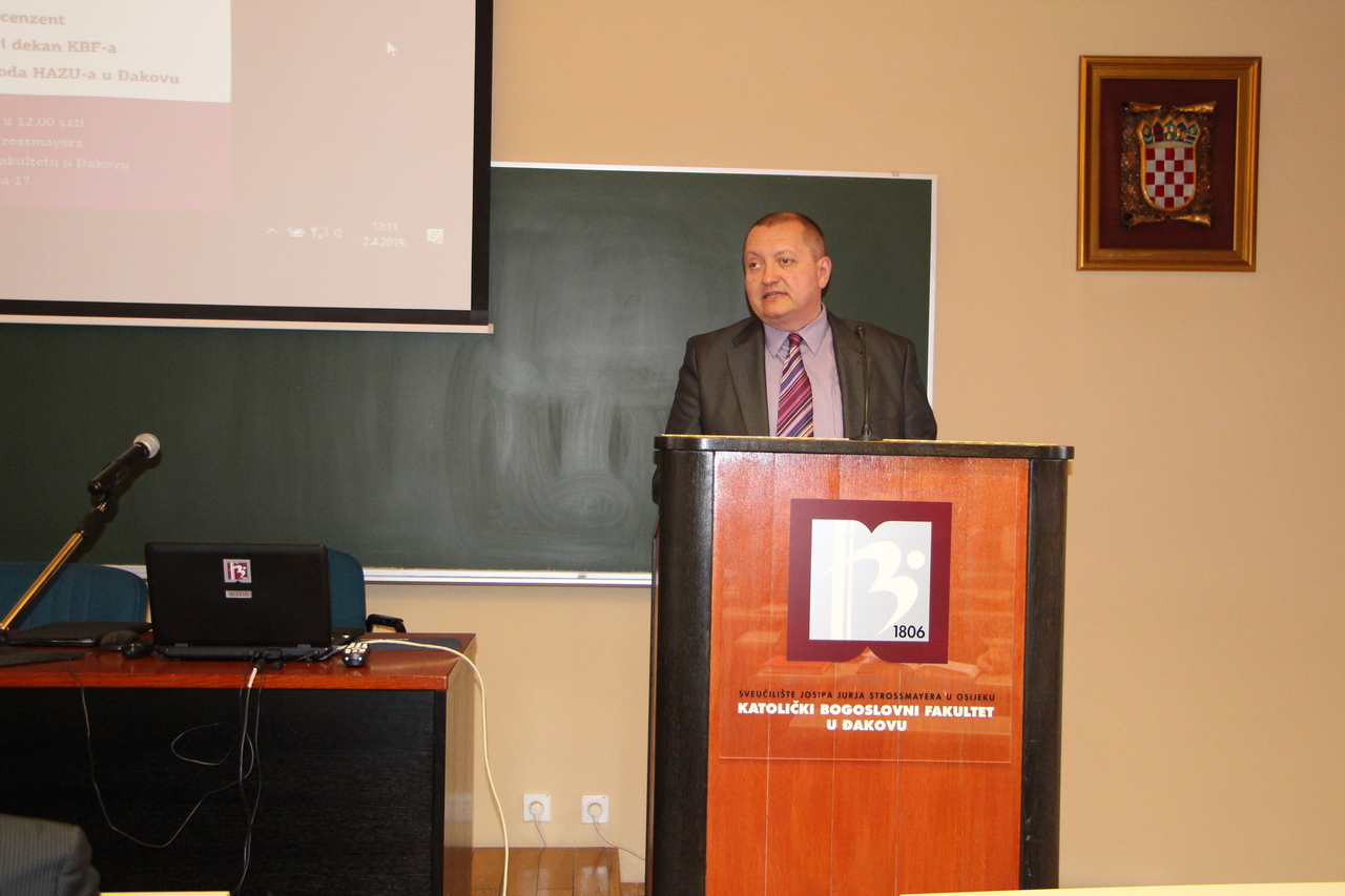 Sljedeće izlaganje pripalo je dekanu izv. prof. dr. sc. Vladimiru Dugaliću koji je bio i autor i sudionik znanstvenog kolokvija i samoga zbornika. Na samom početku dekan je istaknuo kako je ova problematika demografije ključna, a u zborniku se kroz analize i grafikone prikazuje dubina i ozbiljnost ovoga problema. Problem iseljavanja ima dugoročne posljedice za nas i usko je povezan sa padom nataliteta i demografskom situacijom. U zborniku se navode 2 ključna momenta koji su razlog ovakve situacije: prvi se tiče jedne nesređene pravne države i to rađa osjećajem bespomoćnosti pa stoga mladi ljudi odlaze jer ne vide svoju perspektivu ovdje. Drugi je temeljni razlog promjena mentaliteta gdje se dijete ne promatra kao dar, nego se promatra kao teret. Zato ovaj zbornik potiče na razmišljanje koji su zapravo pravi razlozi i navodi važnu ulogu Crkve, razvijanja evangelizacijske socijalne dimenzije, važnost roditelja i civilnog društva… Demografsko pitanje je ključno i strateško pitanje hrvatske budućnosti.i baš zato treba napraviti dugoročnu demografsku politiku , pronaći sredstva za demografsku obnovu, apelirati na politiku u prvom redu, društvo i građane radi rješavanja situacije.