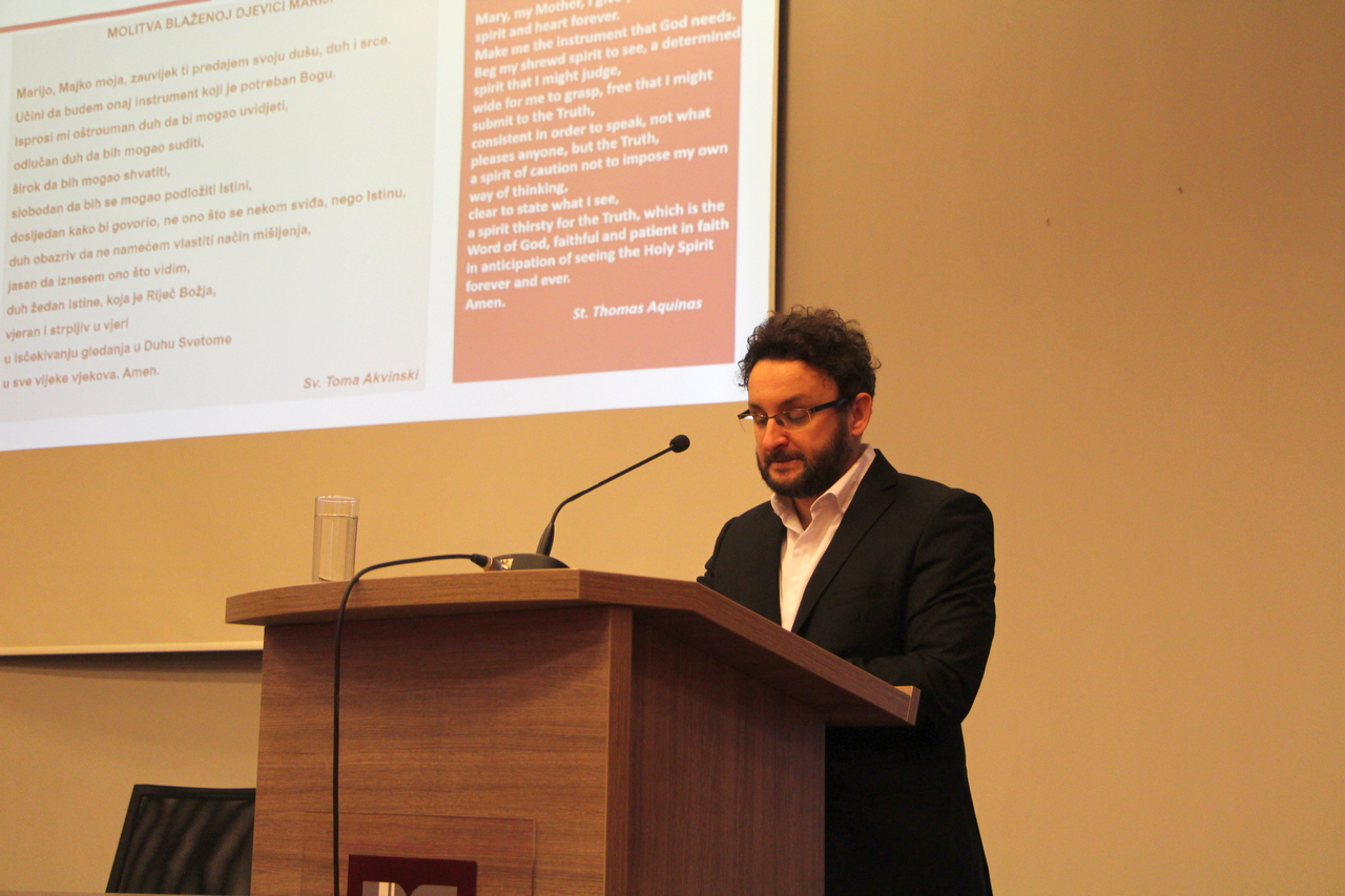 Na početku je sve prisutne pozdravio prof. dr. sc. Šimo Šokčević, v.d. prodekana za znanost i međufakultetsku suradnju. Profesor je naglasio kako je sv. Toma Akvinski bio izuzetno važna ličnost u povijesti kršćanstva i filozofije. Bio je učenik sv. Alberta Velikog i velikan kršćanske misli. U njegovim djelima vidimo da nadilazi vremena u kojima je živio i da je njegova misao duboko utkana u suvremenoj filozofiji i teologiji. Summa teologije predstavlja vrhunac kršćanske misli gdje je Toma pokazao komplementarnost vjere i filozofije. Profesor je potaknuo sve prisutne da ovaj simpozij bude podsjetnik na važnost kontinuirane analize da nastavimo na temeljima koje je postavio sv. Toma i izrazio nadu kako će ovaj simpozij potaknuti nove ideje i interpretacije njegova poučavanja.