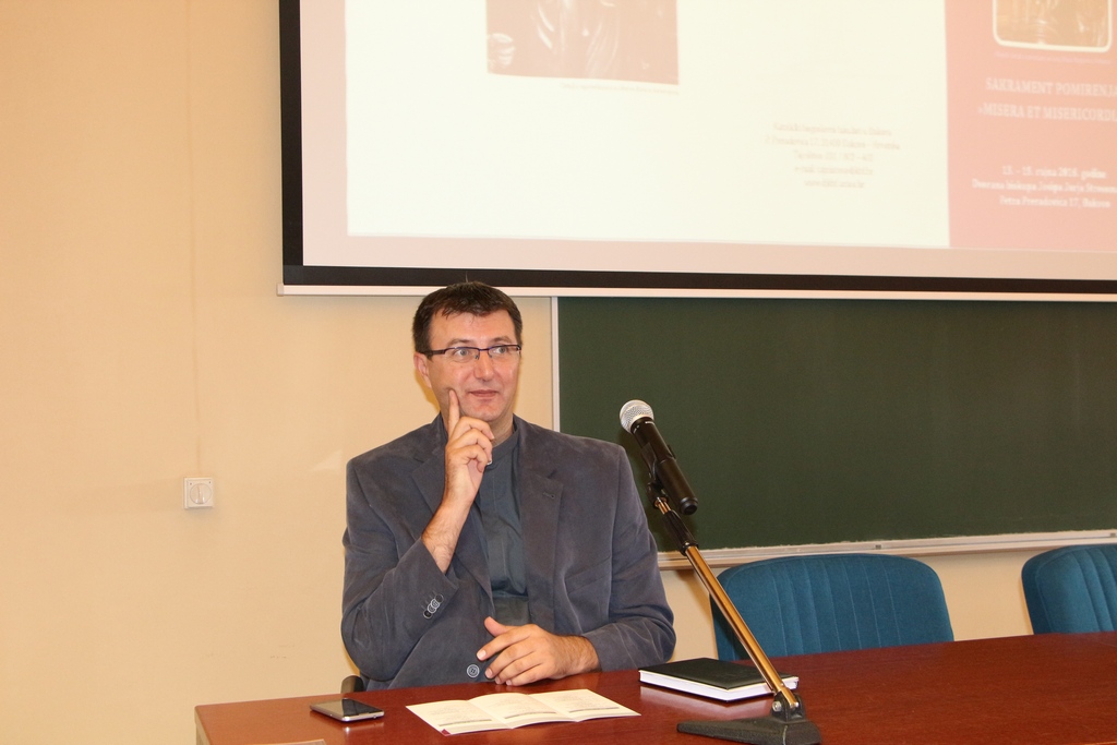 Predzadnje predavanje održao je doc. dr. sc. Davor Vuković na temu „ Odrješenje i pomirenje kao darovi Božje milosrdne ljubavi“. Profesor Vuković je u svojemu predavanju detaljno obrazlagao formulu odrješenja koja sačinjava bit sakramenta pomirenja. Riječi „Bog, milosrdni Otac, pomirio je sa sobom svijet smrću i uskrsnućem svojega Sina..“ bile su obrazac kojega je profesor Vuković objašnjavao te je pritom istaknuo da je odrješenje nedvojbeno povezano sa Božjim milosrđem, a vrhunac toga milosrđa stoji upravo u Isusu Kristu. Otac milosrđa ostvaruje djelo pomirenja u Sinu, ono je Božji dar i zahvat, pomirenje je plod obraćenja i čovjekove suradnje, dakle pomirenje i obraćenje su intimno povezani i nerazdijeljeni. Pomirenje je dar i izazov i zadaća za kršćane. Dakle, samo otajstvo pomirenja ima vid pomirenja sa Bogom, no ono donosi i pomirenje čovjeka sa samim sobom, sa Crkvom i sa drugima u okolini. „I izlio je Duha Svetoga za otpuštenje grijeha …“ pomirenje nam se, nastavio je Vuković, udijeljuje po djelovanju Duha Svetoga, dar Duha nastavlja pomiriteljsko djelo Krista. On potiče srca na obraćenje, kajanje, on nam udijeljuje milost obraćenja. „Neka ti po službi Crkve On udijeli..“– djelo pomirenja je danas djelotvorno u životu Crkve po sakramentima, Krist je svoje apostole i učenike učinio dionicima i autoritetima za službu pomirenja. „Ja te odrješujem od grijeha tvojih…“ – odrješenje označava izljevanje Duha Svetoga, svećenik to čini kao baštinik onog apostolskog autoriteta, u ime Trojedinog Boga u vjeri Crkve kojoj pripada i kojoj je službenik. Dakle, sakrament pomirenja je sakrament Božjeg milosrđa u kojemu Trojedini Bog iskazuje svoje milosrđe .