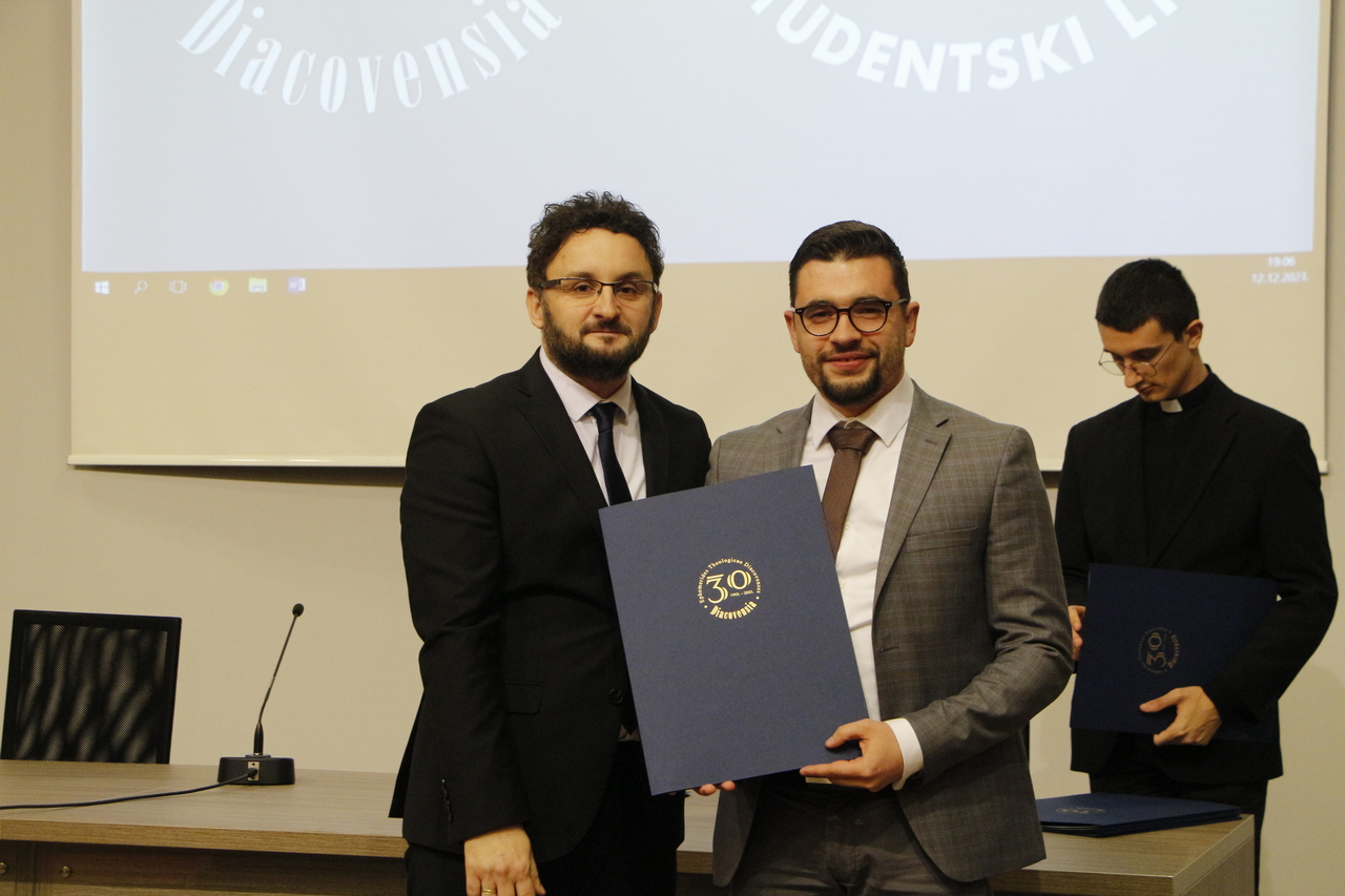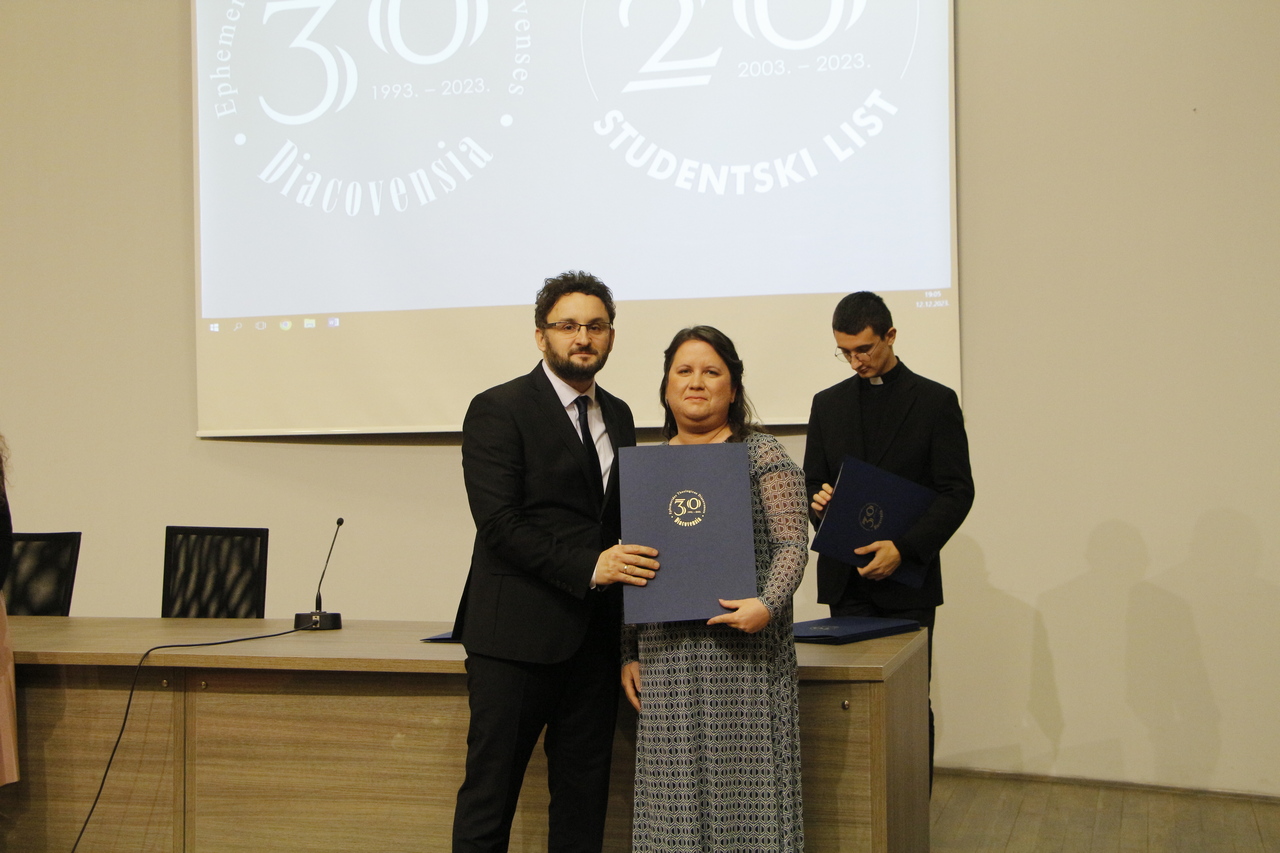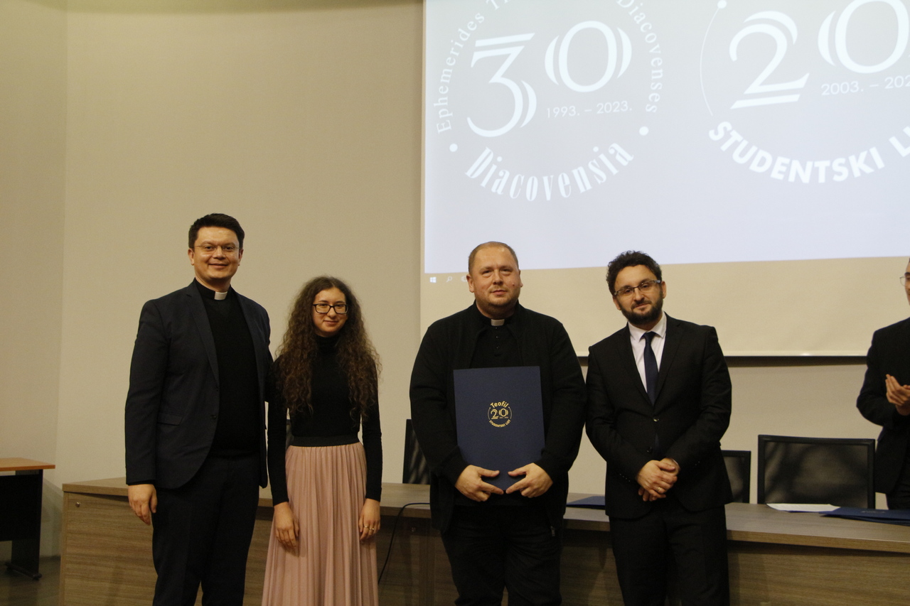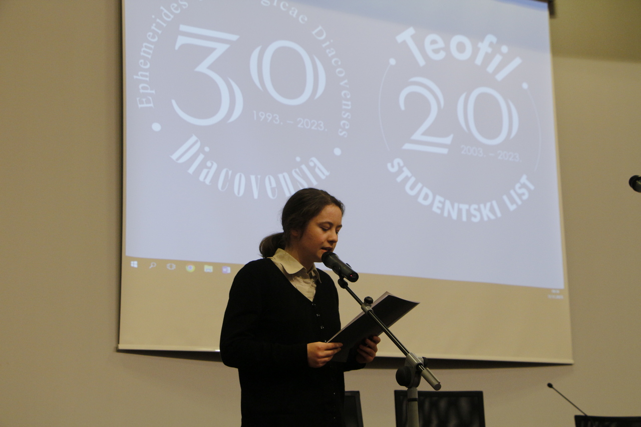 Skupu se prigodnim promišljanjem obratio i prof. dr. sc. Ivan Trojan, dekan Filozofskog fakulteta Osijek. Prof. Trojan govorio je o svojem iskustvu uređivanja časopisa za književnost i kulturu, čestitavši važnu obljetnicu časopisima Diacovensia i Teofil. Promišljanjem naslovljenim „O pisanju” obratio se i glavni i odgovorni urednik časopisa Diacovensia – Teološki prilozi, izv. prof. dr. sc. Šimo Šokčević te progovorio o načelima kvalitetnoga i dobroga pisanja koji obuhvaćaju promišljanje prije pisanja, sigurnost da se ima što za reći, izgradnju vlastita stila, izvornost, poštivanje čitatelja te važnost dobrog naslova pojedinog rukopisa. Uslijedila je interpretacija poezije prema vlastitom izboru iz časopisa Teofil koju su otmjenim i dirljivim tonom, izveli Valentino Kujundžić i Ana Umiljanović. Svojim izlaganjem na temu „Teofil kao mogućnost razvoja kritičkog mišljenja kod studenata teologije”, glavna urednica studentskog lista Teofil, Maria Dragomirović osvrnula se na djelovanje i otvorenost teologa u odnosu na svijet, te na slabljenje kritičkog promišljanja kod studenata kroz protekle godine ohrabrivši pritom studente da se odvaže na pisanje. Na koncu prigodnu riječ uputio je i odgovorni urednik studentskog lista Teofil izv. prof. dr. sc. Boris Vulić zahvalivši se, u ime Uprave KBF-a, glavnoj urednici i uredničkom vijeću lista Teofil, te svim studentima i suradnicima, za sve ono što su vjerno ugradili i što i dalje ugrađuju u Teofil. Istaknuo je kako “knjige uvijek nađu put do svojih čitatelja” što vrijedi i za list Teofil, kojem je jedna od zadaća uhvatiti i prikazati filozofsko-teološku misao. Nakon prigodnih obraćanja uslijedila je podjela povelja zahvalnosti. Povelje zahvalnosti primili su: nadbiskup u miru, mons. dr. Marin Srakić (pružanje oslonca časopisu i doprinos prilozima kojima je obogatio časopis Diacovensia- Teološki prilozi); mons. dr. Đuro Hranić (za podršku, razumijevanje, prihvaćanje koje je kao dijecezanski biskup iskazivao uredništvu časopisa Diacovensia-Teološki prilozi, te lista Teofil); prof. dr. sc. Vladimir Dugalić (8 godina vršenja službe glavnog i odgovornog urednika časopisa Diacovensia- Teološki prilozi, od 1999. do 2007.g.); prof. dr. sc. Ivica Raguž (8 godina vršenja službe glavnog i odgovornog urednika časopisa Diacovensia- Teološki prilozi, od 2008. do 2016.g.); Ekonomat Nadbiskupije (materijalna i prijateljska podrška kojom se dugi niz godina osiguravalo redovito tiskanje časopisa); UZUK (pružanje materijalne podrške i potpore časopisu); prof. dr. sc. Vlado Guberac, rektor Sveučilišta J. J. Strossmayera u Osijeku (prijateljska podrška i materijalna pomoć časopisu Diacovensia-Teološki prilozi i časopisu Teofil); mons. Ivan Ćurić (prijedlog koji je izabran kao naziv znanstvenog časopisa Katoličkog bogoslovnog fakulteta u Đakovu); Željko Filajdić (predan i marljiv rad u realizaciji svakog broja); Mirko Mihaljević (neumoran i predan rad, beskrajno strpljenje, profesionalnost i dugogodišnju suradnju); Sabina Luketić (neumorna briga, marljivost i stručnost u pogledu lekture); Damir Latin (velik doprinos i dugogodišnju predanu suradnju); Dino Klem (2 godine vršenja službe stručnog suradnika časopisa Diacovensia-Teološki prilozi, od 2017. do 2019.g.); Antonija Pranjković (5 godine vršenja službe stručne suradnice časopisa Diacovensia- Teološki prilozi, od 2008. do 2013.g.); prof. s. Marija Stela Filipović (briga za ljepotu hrvatskog jezika u časopisu Diacovensia-Teološki prilozi ); prof. Divna Ćurić (višegodišnji i predan rad na prijevodima i lekturi engleskoga jezika u časopisu Diacovensia-Teološki prilozi); mr. sc. Josip Filipović (entuzijazam i trud ugrađen u Teofil); Marin Ivanišić (pružanje tehničke pomoći u pripremanju časopisa Teofil i za veliko zalaganje u svakom povjerenom zadatku); Ana Vladić (lektura tekstova i suradnja); doc. dr. sc. Tomislav Ćurić (za prijedlog koji je izabran kao naziv lista Teofil i autora prvog loga lista); studentski zbor J. J. Strossmayera (dugogodišnju prijateljsku i materijalnu podršku u izdavanju studentskog lista Teofil). Časopisima su pristigle brojne čestitke od suradnika i prijatelja diljem Republike Hrvatske, Europe i svijeta. Nakon službenog dijela akademije i posljednje glazbene točke, svi nazočni bili su pozvani pogledati prigodnu izložbu koju su u navedenoj prigodi pripremile knjižničarke Tihonija Zovko i Ankica Landeka. Svečanost je završena domjenkom i druženjem.