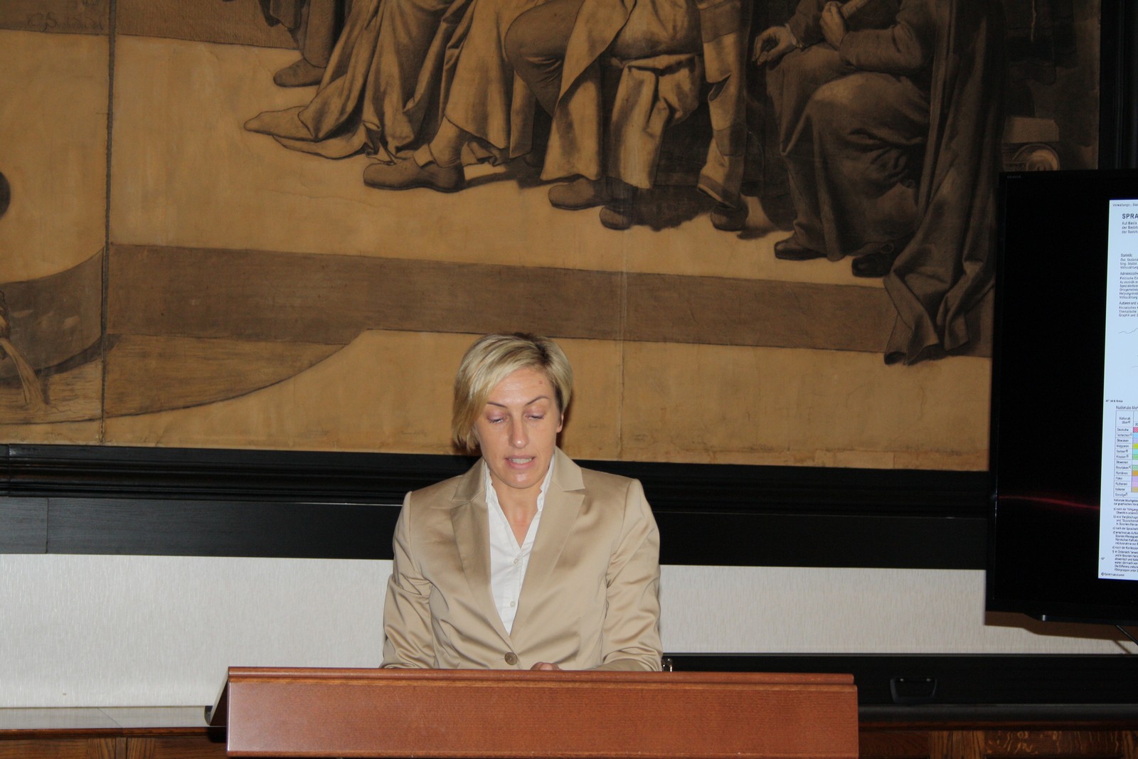 Dr. Damjanović Barišić u svome predavanju pozabavila se pitanjem rješenja hrvatskog (slavenskog) pitanja te utjecajem biskupa Josipa Jurja Strossmayera na rješavanje istog. Predavačica je istaknula kako biskupovo djelovanje treba promatrati u okviru čitave Habsburške Monarhije i čitave Europe 19. i 20. stoljeća. Kao glavni problem, biskup Strossmayer je isticao položaj Hrvata u Monarhiji u kojoj hrvatski narod, prema riječima biskupa, nije bio u ravnopravnom položaju s drugim narodima. Upravo je takav položaj probudio želju kod biskupa da se bori za prava i jednakosti svih Slavena. U vijeću se zalagao za federalističku koncepciju, a 1960. postaje članom proširenog carevinskog vijeća gdje se još više bori za prava svog naroda. Za poznavanje pravog položaja Hrvata u 19. stoljeću vrlo je važna korespondencija biskupa Strossmayera i Eugena Kvaternika. U prvom pismu saznali smo kako Eugen Kvaternik upozorava biskupa na minoran ugled Hrvatske, te ugroženost od Mađara, Srba i Talijana. U svojim govorima biskup Strossmayer je isticao kako Dalmacija nije zahvaćena duhom Italije, već da je to prostor koji pripada hrvatskom narodu. Na to je Eugen Kvaternik odgovarao s oduševljenjem. U posljednjem pismu Eugen upozorava na ugroženost Istre od strane Talijana i ističe kako će ujedinjena Hrvatska postati snažan štit Beču. Nakon niza sazivanja i raspuštanja sabora i dalje situacija nije bila jasna. Oko pitanja Hrvatske i Ugarske zajednice političari su bili podijeljeni. 1961. na sabor se polako primjećuje razlika stavova između Strossmayera i Kvaternika. Predavačica je naglasila da je Kvaternik bio spreman pristati na kompromise, dok je Strossmayer i dalje ostao čvrsto pri svojim stavovima. U sljedećem dijelu izlaganja dr. Damjanović Barišić je istaknula važnost istočnog pitanja. Strossmayer je isticao da se ovim pitanjem treba baviti svaki hrvatski političar, a u tome radu se istaknuo Franjo Rački. Nakon niza neuspjelih pokušaja rješavanja političke krize, Strossmayer se povlači iz političkog života i svoje snage ulaže u kulturno i vjersko ujedinjenje Slavena.
