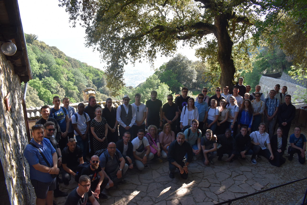 Nedjelju smo započeli obilaskom Porcijunkule i jutarnjom molitvom. Potom smo se zaputili u u Asiz, u crkvu sv. Klare, posjetili smo i svetište svlačenja svetoga Franje, grob bl. Karla Acutisa, gdje smo izmolili srednji čas, a potom smo obišli rodnu kuću sv. Klare i katedralu sv. Rufina. Nakon okrjepe, zaputili smo se pješice do Samotišta Carceri. Na putu je bila mogućnost svete ispovijedi te se većina studenata putem ispovjedila, duhovno naznačujući da se u ispovijedi uspinju dušom na brdo susreta s Bogom, kao što je to činio sv. Franjo u Samotištu. U Samotištu smo slavili sv. misu koju je predvodio izv. prof. dr. sc. Boris Vulić. Svoju je homiliju započeo tumačenjem prve Crkve koja se okupljala oko apostola i naglasio kako smo i mi sada svi skupljeni na istome mjestu kao i prvi učenici. Mi smo ta Crkva koja je ustanovljena po Petru i apostolima. Isto tako, rekao je profesor, gdje je zajedništvo, ondje je i Duh Sveti. U svakoj svetoj misi vidi se najljepši izričaj zajedničke Crkve – vjernici na zemlji, anđeli i arkanđeli, svete duše, trpeće duše u čistilištu i sam Trojedini Bog. No, profesor je naglasio i da moramo naučiti biti sami kako bismo mogli biti dio zajednice, ud Kristov. Riječ „carcere“ znači sobica, ali i zatvor, ćelija. Tako ovaj prvi smisao označava osobu koja je u zajedništvu s Bogom, ona je radosna osoba, dok drugi smisao pojma obuhvaća osobu koja nije znala za zajedništvo sa drugima i sa Bogom pa je to žalosna, zatvorena osoba. Svi mi u sebi imamo ćelije, mjesto gdje smo sami, gdje promišljamo o Bogu, o nama, o drugima, a onda izlazimo iz tih ćelija i odlazimo u zajednice. Važno je da su naše ćelije uvijek otvorene djelovanju Duha Svetoga. Nakon sv. mise, obasjani zalaskom sunca u Samotištu, izmolili smo i večernju molitvu te se pješice u šutnji i molitvi vratili u grad te smo imali slobodno vrijeme za druženje i razgledavanje.