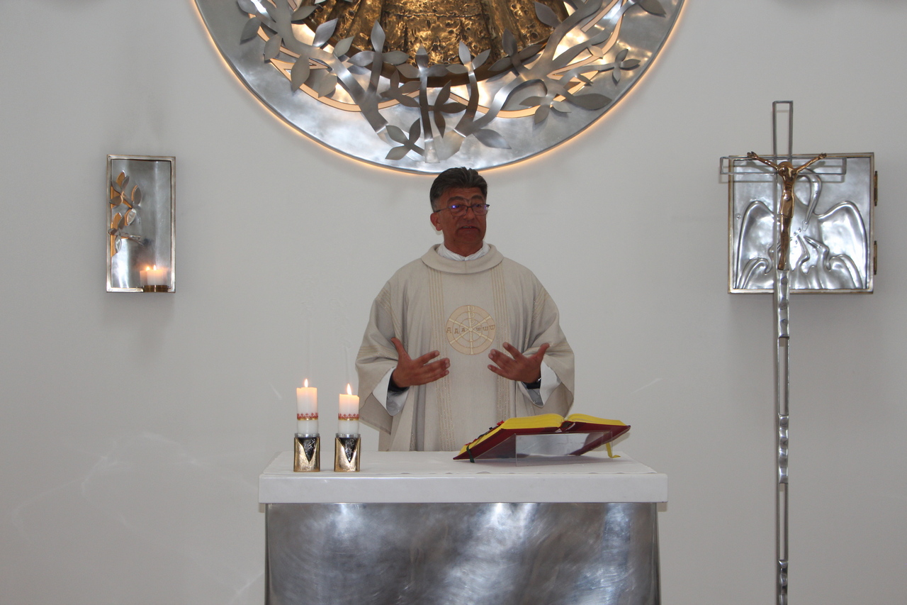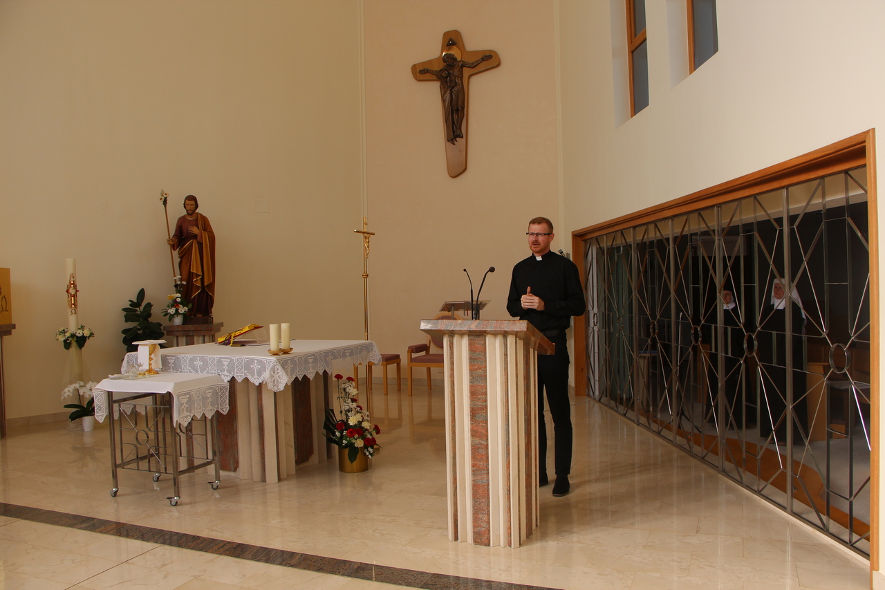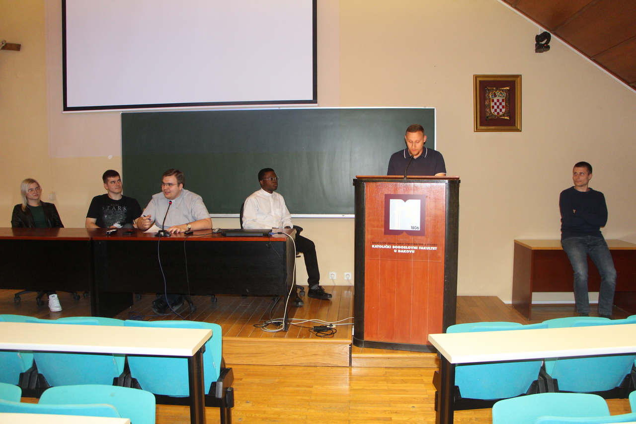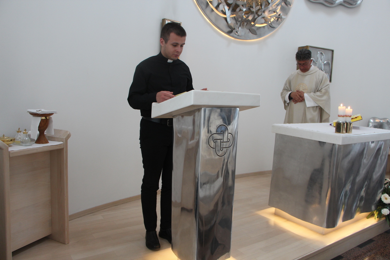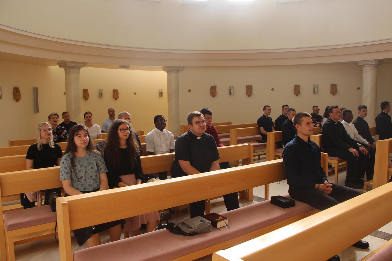 Nakon radionice, uslijedila je sveta misa koju je slavio izv. prof. dr. sc. Ivica Pažin, v.d. dekana Fakulteta. U svojoj je homiliji dekan naglasio rečenicu iz Ivanovog evanđelja kojom možemo opisati čitavo čovječanstvo: Bog je tako ljubio svijet te je dao svoga Sina Jedinorođenca da nijedan koji u njega vjeruje ne propadne, nego da ima život vječni. U toj rečenici naznačene su one vrijednosti koje, s jedne strane opisuju Boga, a s druge strane nas. Istaknuo je pojmove ljubavi i vjere, te da na definiciju Boga kao ljubavi ne možemo odgovoriti samo racionalnom spoznajom, nego onim što je duboko u nama i što budi u nama očaravanje. Ljubav je prožeta i satkana u onom što bismo kao odgovor trebali Bogu ponuditi, a to je naša osobna vjera. Vjera je, s jedne strane naš štit, a s druge strane i naša dimenzija ljubavi kojom možemo izreći naše vlastito ophođenje prema Njemu.