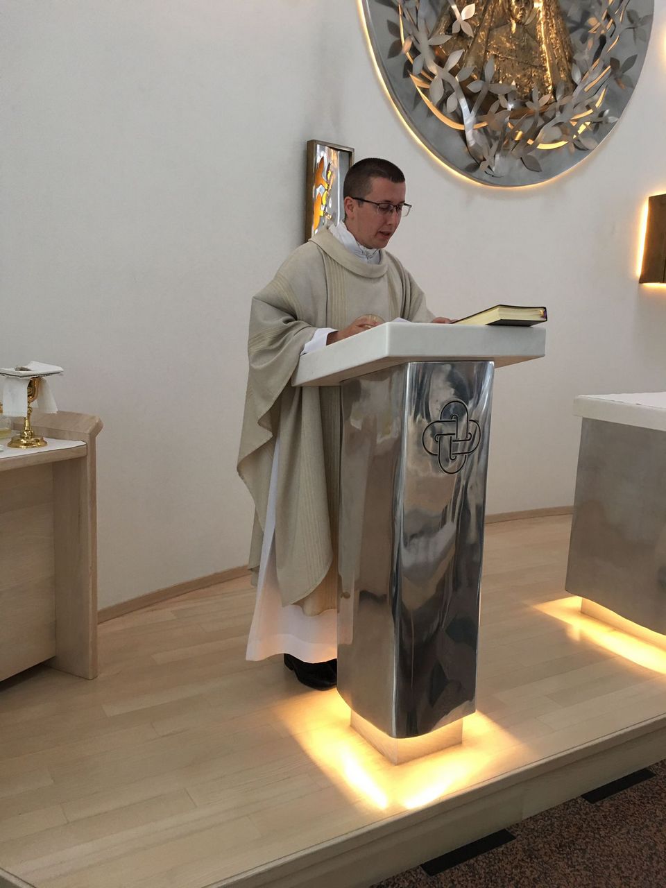 Nakon razgovora sa studentima, uslijedila je sveta misa koju je slavio velečasni Katačić u koncelebraciji sa prof. Matezovićem. U homiliji, vlč. Katačić osvrnuo se na navještenje opisano u Lukinu evanđelju. Ono je događaj poniznosti, skriven je, nitko za njega ne zna, a opet, ono je odlučujući događaj za povijest čovječanstva. Marijinim „da“ začet je Isus i njezin „da“ je i Isusov „da“. Sv. Ivan od Križa kaže da je Bog od samog trena začeća uzdigao Mariju u stupanj preobraženja. Novi zavjet, novi savez započinje anđeoskim pozdravom Mariji. Grčki izričaj „kaire“ – raduj se, nagoviješta kako se već ovdje vrata otkupljenja otvaraju čitavom čovječanstvu. Adam je pao u grijeh i osudio nas na smrt, a Krist, novi Adam, svojim posluhom otkupljuje nas od zaslužene kazne. Anđeo naviješta da Bog nije zaboravio obećanje da će izdići potomka Davidova kraljevstva, ali ovo Kraljevstvo nije izgrađeno na svjetovnoj moći, ne poznaje kraja jer u njemu kraljuje Bog. Umjetnici uglavnom prikazuju događaj utjelovljenja na način da Marija u kući moli, a anđeo dolazi s ljiljanom. Tako vidimo da Marija njeguje svoj duhovni život i ogleda se u Božjoj riječi, dok je ljiljan simbol čistoće. Dolazak Boga ne može se dogoditi van kuće, mora biti u molitvi. Isusovo je utjelovljenje novo ostvarenje zemaljskog raja kod nas u duši, Bog vraća dušu u svoj zagrljaj. Pomoć na putu sjedinjenja s Bogom su sakramenti pa će tako sveti župnik Arški reći da je oltar krilo Marijino gdje se neprestano začinje i rađa Bog. Svoju je homiliju zaključio zazivom da nas Bog već na zemlji učini dionicima svojega božanstva.