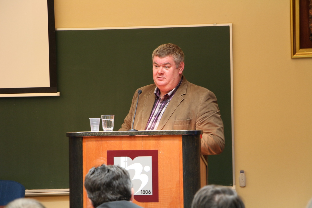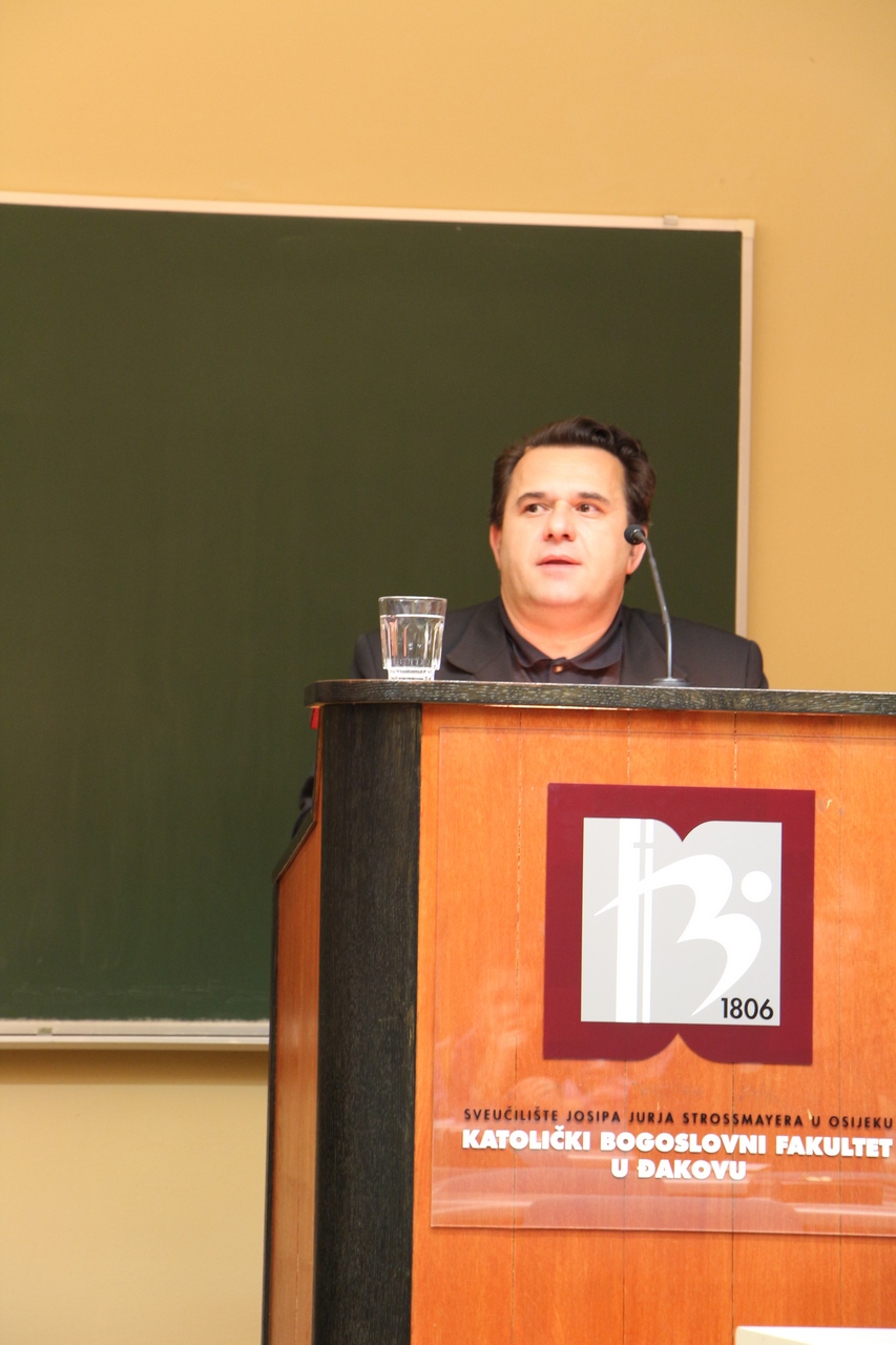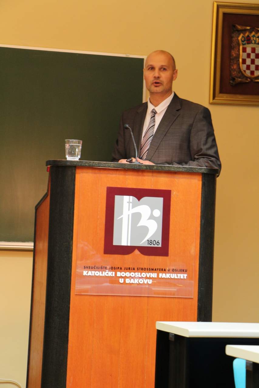 Na samom početku izlaganja dr. Vladimir Dugalić istaknuo je da enciklika “Laudato si” nije tekst koji je tek tako nastao, misleći na to da se ona nastavlja na prethodne enciklike pape Benedikta XVI. U svom predavanju zaobišao je biblijski uvod jer mu je prof. Pardon poslužio kao uvod za njegovo izlaganje. Čovjek je u neprestanom odnosu prema svijetu od onda od kad je nastao ljudski rod. Zanimljivo je da nekadašnji čovjek nije bio sposoban ugroziti prirodu, no današnji jest i to je učinio. S teološkog gledišta temeljna je postavka da je čovjek stvoren na sliku Božju, prema kojoj je čovjeku povjeren svijet i stoga su već tada bili jasni grijesi protiv prirode. Iz toga je čovjek odgovoran za sve što je učinjeno prirodi. Papa Ivan Pavao II. istaknuo je da je rad čovjekovo dobro, jer rad je aktivnost kojom se preobražava priroda, prilagođava se čovjekovim potrebama. Krivo je promatrati čovjeka kao sredstvo proizvodnje. Radom ulazi u odnos prema drugim ljudima, Bogu i u konačnici samoj prirodi. Nužna je veza između znanosti i prakse. Danas je vjera nešto nevažno za svijet i čovjekov odnos prema stvorenom. Iz svega toga se razvija nova religija poznata pod nazivom vjera u napredak. Cilj takve religije je stvoriti ljudsko kraljevstvo, a do toga dolazi jer se sve odvija prema paroli „Razumom protiv vjere!“ Papa Benedikt smatra da je napredak nešto što dovodi do dvije posljedice – mogućnost za mnoga dobra, ali i mogućnost za mnoga zla. Čovjek danas pokušava razviti instrumentalizirani razum. Rješenje je vidljivo u ponovnoj suradnji vjere i razuma, treba vratiti njihovu cjelovitost. Razum se mora otvoriti spasenjskim aspektima vjere. Treba se izdignuti izvan sebe. U slijedećem dijelu izlaganja dr. Dugalić je stavio naglasak na antropocentrizam. Bit antropocentrizma je u tome da se čovjek promatra kao razumska životinja. Uzima čovjeka kao središte i njegov život dobiva prvenstvo nad drugim oblicima života. Čovjek postaje kriterijem morala, sve staje na čovjeku. Zbog toga čovjek postaje apsolutnim gospodarom, a iz toga slijedi da se urušava sam temelj ljudskog stvorenja. Ključna poruka enciklike je da nećemo ništa promijeniti ako se ne odmaknemo od ovog antropocentrizma. Pravi ekološki pristup mora uključiti ljudski pristup. Na samom kraju se predavač još dotaknuo kulture tehnokracije koja je i dovela do svega ovoga. Ako čovjek ne otkrije pravo mjesto sebe u svijetu u konačnici radi sam protiv sebe. U tehnici nije riječ o profitu nego stvar je u moći. Moć je nešto što dovodi do odvojenosti čovjeka od Boga, a rješenje je vidljivo u vraćanju na teocentrizam.