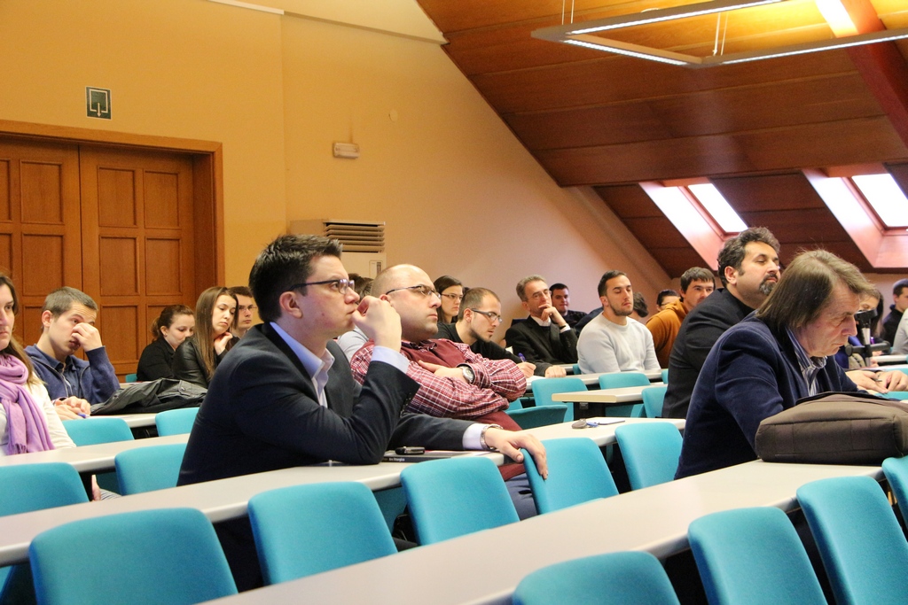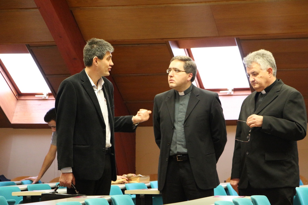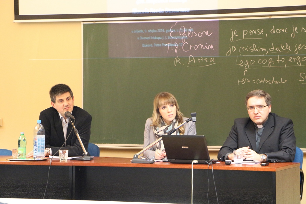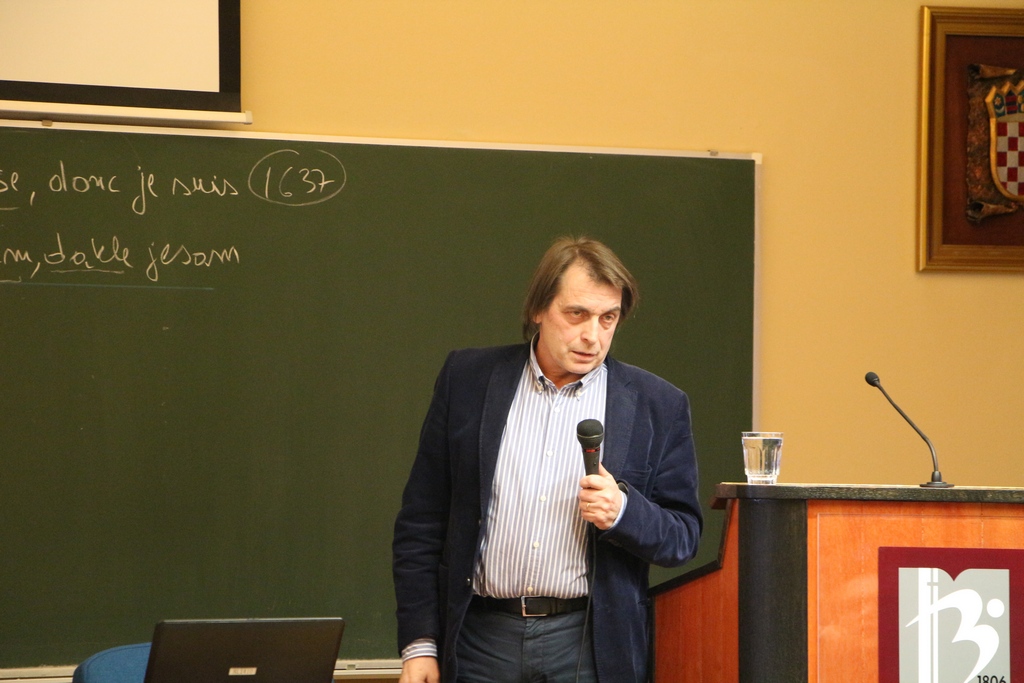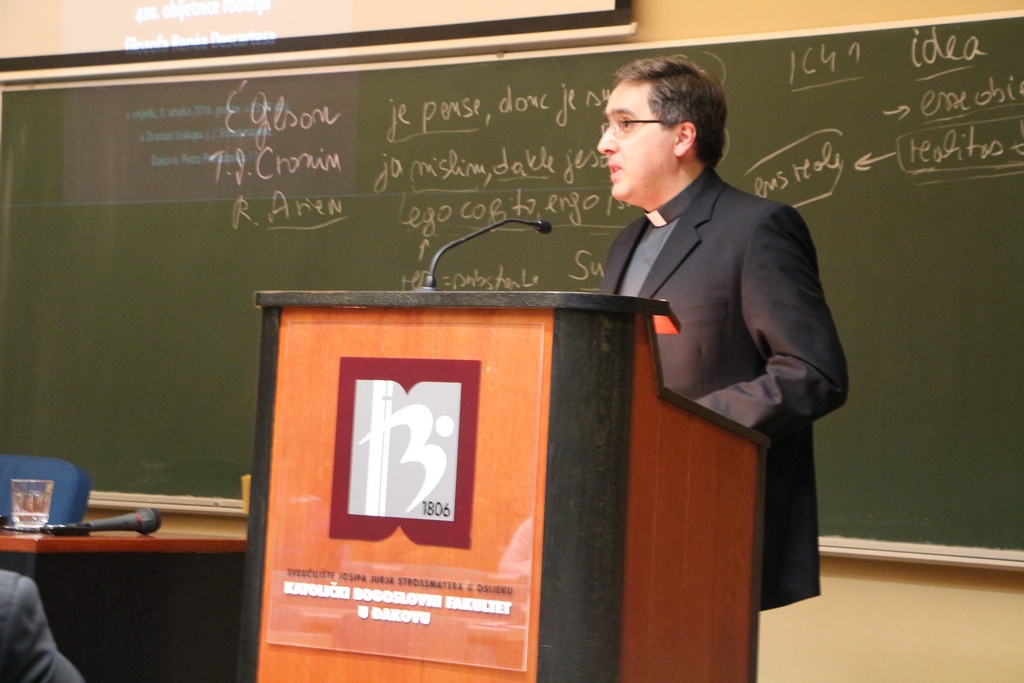 “Descartesova misao o Božjem postojanju” bio je naslov prvog predavanja koje je održao prof. dr. sc. Ivan Tadić. Descartesa je predstavio kao filozofa sumnje, ali nikako skeptika. Glavni cilj mu je bio doći do sigurnosti, a jedna od takvih je glasovita misao: “Mislim, dakle jesam!” Kroz sumnju, čovjek si priznaje ograničenosti i samo na takav način dolazi do spoznaje Boga, isticao je u svojoj filozofiji Descartes. Profesor Tadić je u svom izlaganju stavio naglasak na tri dokaza o Božjem opstojanju, koje Descartes iznosi u svom djelu “Meditacije o prvoj filozofiji”. U prvom dokazu usmjerava se prema urođenosti ideje o Bogu. Za Boga kazuje da je beskonačna i razumna supstancija koja je stvorila sve što postoji. U svom drugom dokazu postavlja pitanje: Ako Bog ne postoji, odakle ja? Descartes se poziva na načelo uzročnosti i zaključuje da je u gradaciji uzroka nemoguće ići u beskonačno, već treba stati u Savršenom, tj. Bogu. I posljednji dokaz je taj u kojemu Descartes izjednačuje ideju Boga s idejom trokuta. Iako trokut ne postoji, njegovu bit poznajemo, a upravo to možemo reflektirati na ideju Boga. Ideja Boga je tako urođena, ona je prva među svim idejama, a reći da Bog ne postoji, znači savršenome oduzeti savršeno. “Bog o kojemu je Descartes govorio nije nametljivi Bog, on je onaj koji nas je uznemirio, a to predstavlja izazov za um, te draž za vjeru.” , zaključuje profesor Tadić.